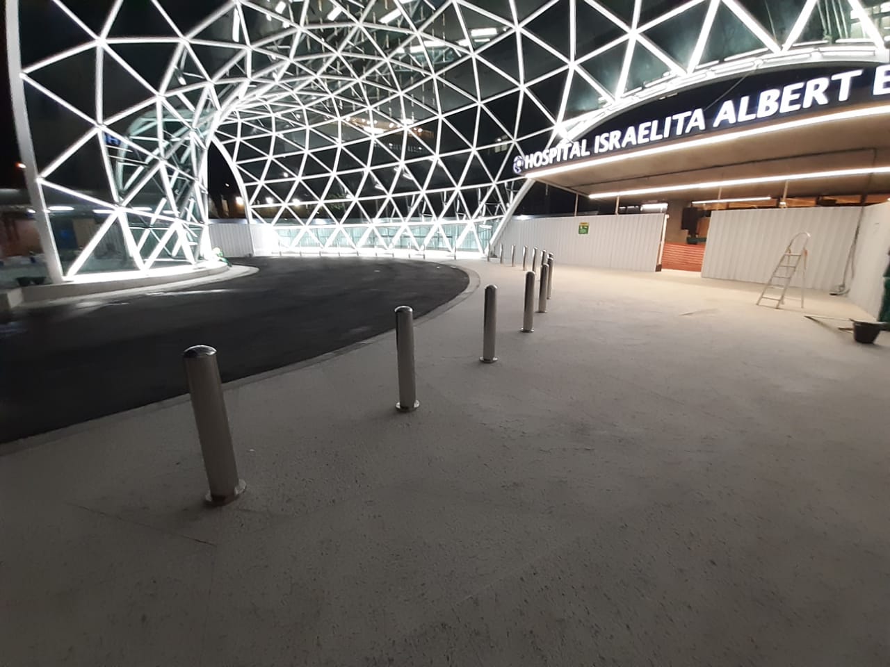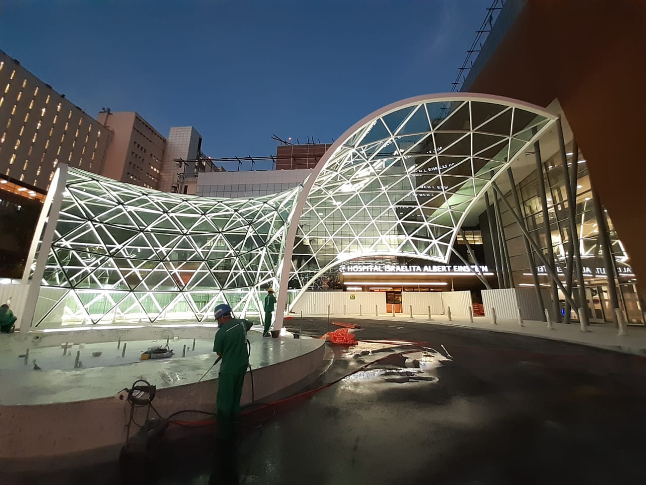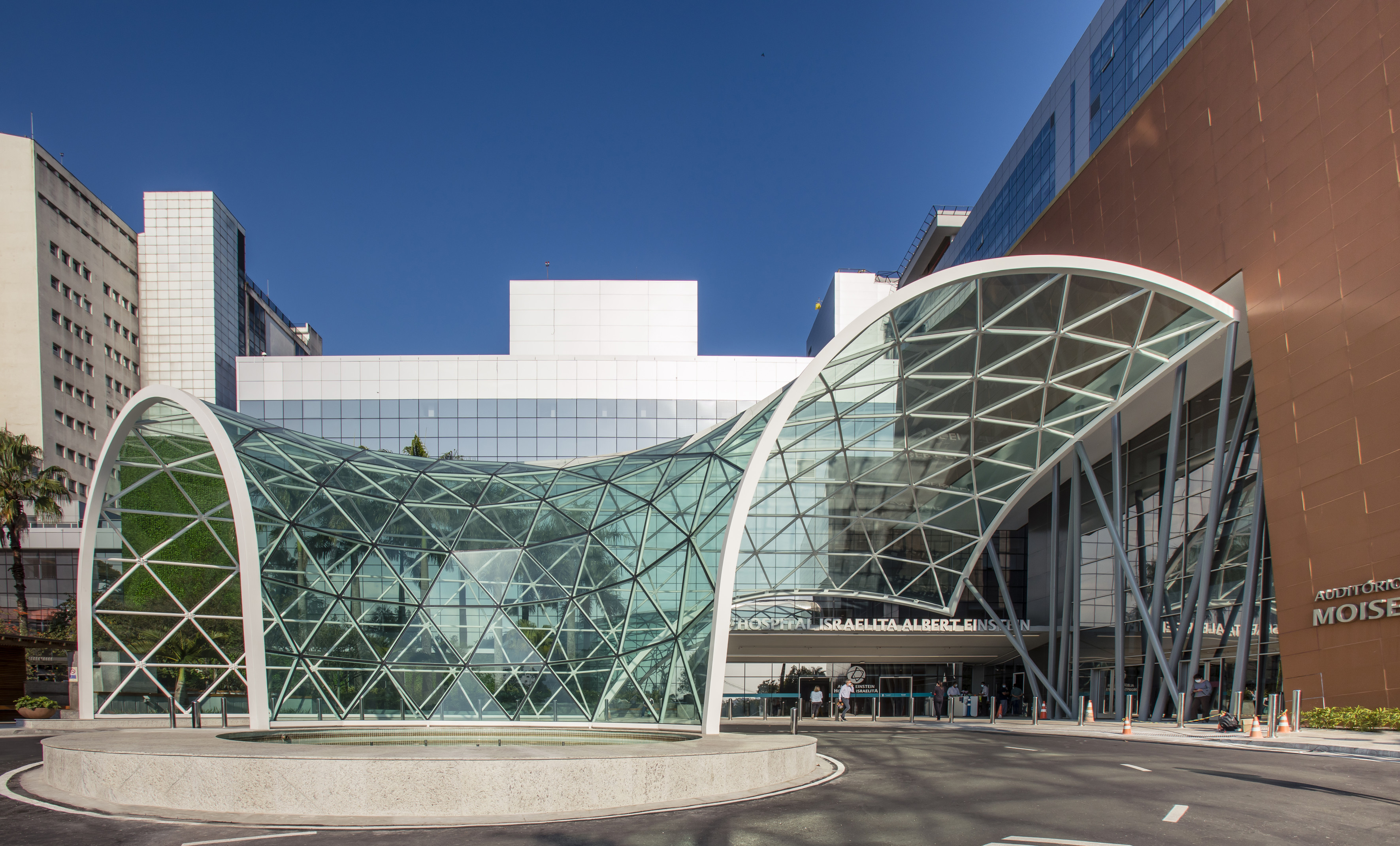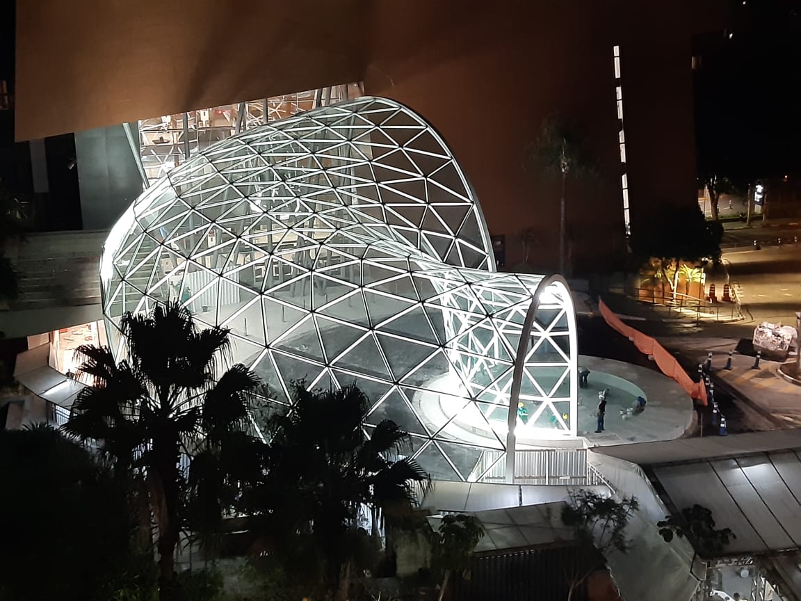 Marquise em geometria orgânica com vidros laminados de controle solar triangulares.
